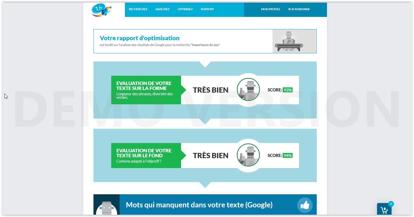 Ensuite, il vous présente un rapport d’optimisation. Il vous affiche les scores de l’évaluation du texte sur la forme et le fond. Puis il vous présente une liste de mots manquants. C’est cette dernière qui est très utile pour booster votre rédaction web en intégrant le mieux possible les termes mentionnés.