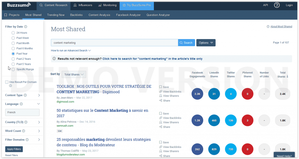 Grâce à BuzzSumo vous allez pouvoir découvrir les tendances dans un domaine donné et les influenceurs les plus suivis. Vous pourrez aussi y trouver de l’inspiration, voir quel type de titre, sujet et contenu performe le plus.