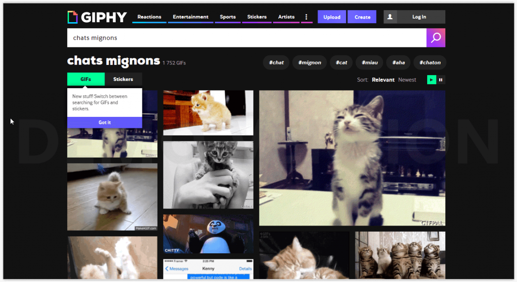 Pour les adeptes des chats mignons et les autres aussi, le site web Giphy est une référence pour les GIF animés. Son moteur de recherche permet de trouver rapidement celui qu’il vous faut. Les Gif sont taggés et classés par catégories et sous-catégories.