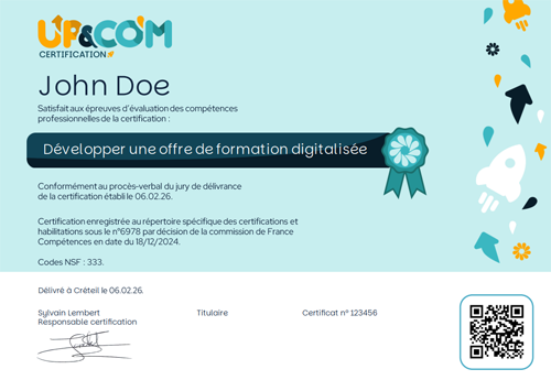 La certification « Développer une offre de formation digitalisée », enregistrée à France Compétences sous le numéro RS6978, s’adresse à un public de formateurs indépendants souhaitant développer leur activité en mettant en place une offre de formation digitalisée.