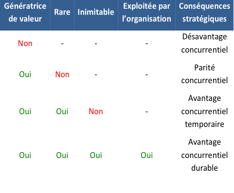 En 2006, Hesterly et Barney, estiment qu’une ressource est source d’avantage concurrentiel si cette dernière répond à quatre grands critères formant le modèle VRIO :