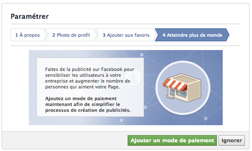 Cette étape est totalement facultative. Sur Facebook, vous avez la possibilité de faire de la publicité payante en ciblant un type de fans par exemple. Si vous pensez faire de la publicité payante sur Facebook ajoutez d'emblée votre mode de paiement. Si cela n’est pas dans vos projets immédiat, ignorez juste cette étape.