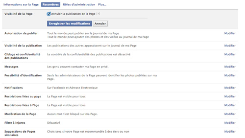 Oui mais seulement voilà : comme elle est pour l’instant bien vide cette page, vous ne voulez pas qu’elle apparaisse aux yeux de tout le monde avant d’avoir un peu étoffé toutes les informations et votre mur ? Pas de problème : vous allez pouvoir bloquer la visibilité de la page le temps de vous roder un peu.