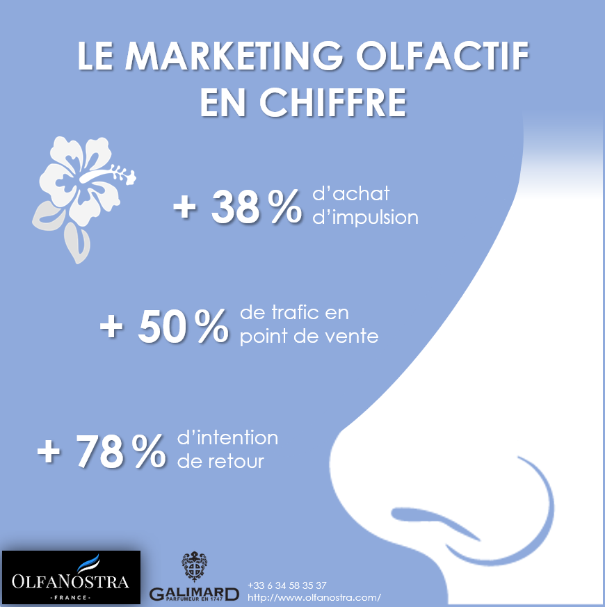 Comme nous pouvons aussi le voir en dessous dans cette infographie rapportée par Olfa Nostra, les parfums dans votre magasin peuvent augmenter en moyenne les achats impulsifs de 35% et les retours en boutique de 78% !