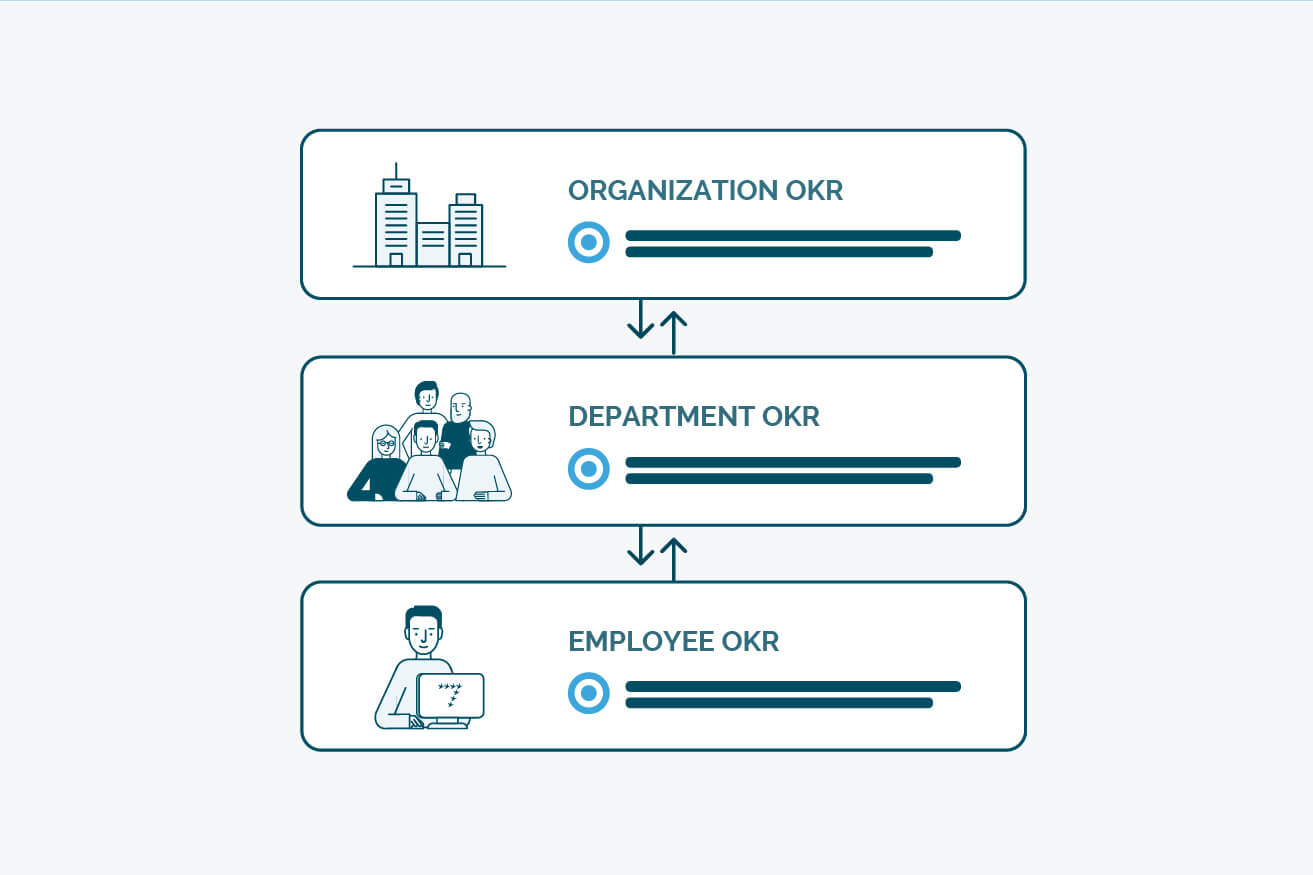 - Approche bidirectionnelle : Les OKRs utilisent une approche simultanée de haut en bas et de bas en haut. L’entreprise (généralement de niveau C) fixe les objectifs stratégiques (top-down) que chaque département et chaque membre de l’équipe doit utiliser pour rédiger ses propres objectifs (bottom-up) alignés sur les objectifs de l’entreprise. Une bonne règle de base est qu’au moins 60 % de chaque objectif doit être créé de manière ascendante.