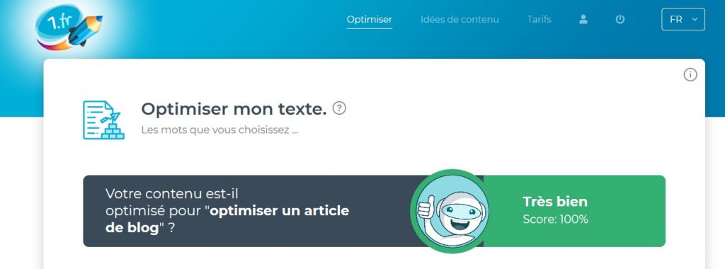Pour aller plus loin, ouvrez un compte sur 1.fr. À partir d’un mot-clé, le site vous fournira une liste d’expressions et, à partir d’un texte, il vous affichera les termes co-occurents permettant d’améliorer le SEO après vous avoir affiché un pourcentage d’optimisation. Voici le résultat de cet article :