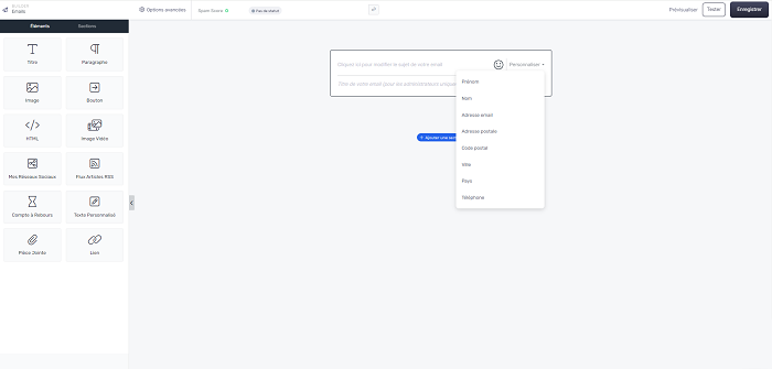 - À l’étape suivante, écrivez votre email avec l’objet (par exemple Bienvenue, Cadeau gratuit…) que vous pouvez personnaliser avec les nombreuses variables à votre disposition (Prénom, Nom, Adresse email, Adresse postale, Code postal, Ville, Pays, Téléphone) ;