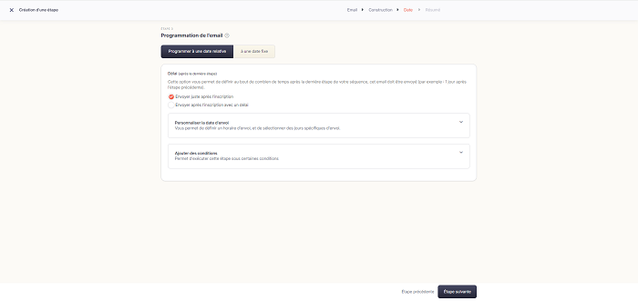 - Remplissez d’autres options, mais qui restent facultatives : personnaliser la date d’envoi, l’horaire, les jours de la semaine et ajouter des conditions (par exemple si le contact est inscrit dans une autre séquence, s’il a ouvert l’envoi précédent, etc.) ;