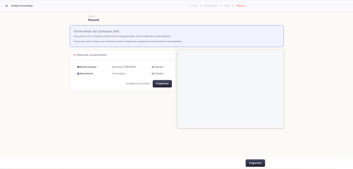 - Votre mail est presque prêt ! Vérifiez que tout est bien configuré en regardant le résumé de la programmation du mail dans la séquence. Si tout est correct, cliquez sur le bouton en bas à droite pour programmer l’email.