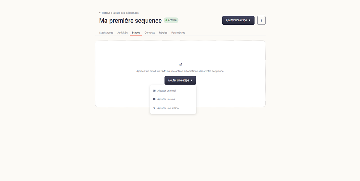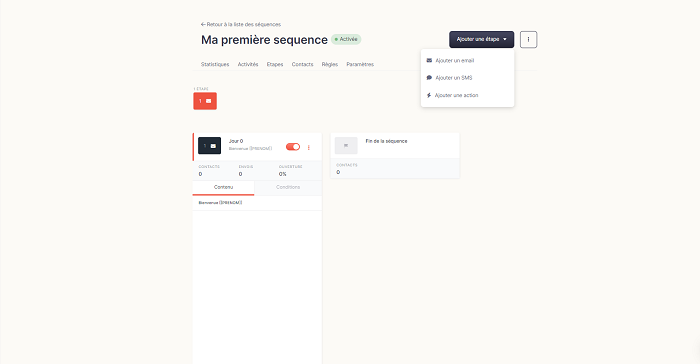 À cette étape, vous allez partir de 0en ajoutant une étape où vous avez plusieurs possibilités (ajouter un email, un SMS, une action).