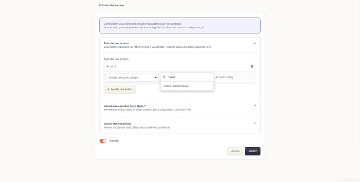 - Pour cela, cliquez sur « Exécuter ces actions », « Ajouter un tag au contact », attribuez le tag « Ouvert » puis paramétrez le délai pour donner le temps au contact d’ouvrir les emails et les conditions pour attribuer le tag.