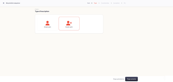 - La prochaine étape consiste à paramétrer le Type d’inscription : Simple optin ou Double optin. Cette dernière consiste à faire valider l’inscription par email à votre abonné, la plus recommandée par rapport au simple optin qui ne demande pas de validation et peut donc contenir de faux emails notamment.