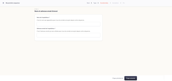 - À l’étape 3, vous allez entrer le nom et l’adresse email d’envoi de l’expéditeur. Si le nom apparaît pour tous les emails envoyés depuis la séquence, l’adresse email sera utilisée pour tous les emails envoyés depuis la séquence ;