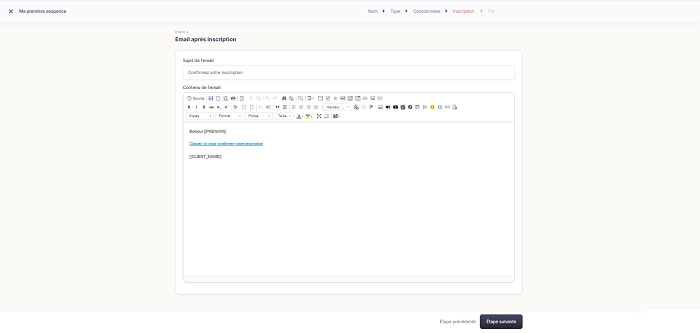 - Si vous avez choisi le double optin, modifiez l’email de confirmation avec le modèle déjà prédéfini si vous le souhaitez. N’oubliez pas de bien expliquer de cliquer sur le lien pour confirmer l’inscription de votre contact.