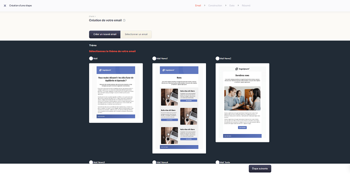 - Après avoir cliqué sur « Ajouter un email », vous avez la possibilité de créer des emails à partir de templates ou de créer des emails déjà créés ;