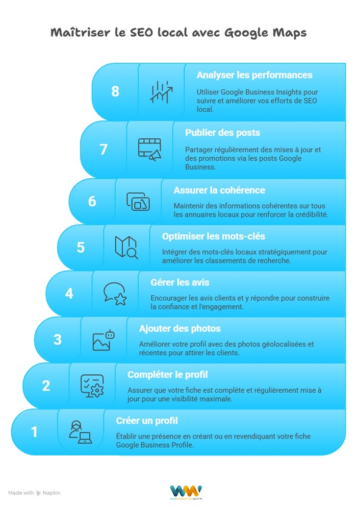 Pour atteindre ces objectifs, appliquez ces 7 actions, de l’optimisation de la fiche jusqu’à la publication régulière de posts avec des CTA. Et surveillez votre évolution avec Google Business Insights.