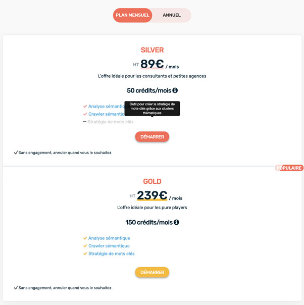 Enfin, la troisième fonctionnalité repose sur l’organisation optimale des mots clés en clusters thématiques qui vous aidera à créer vos pages piliers.