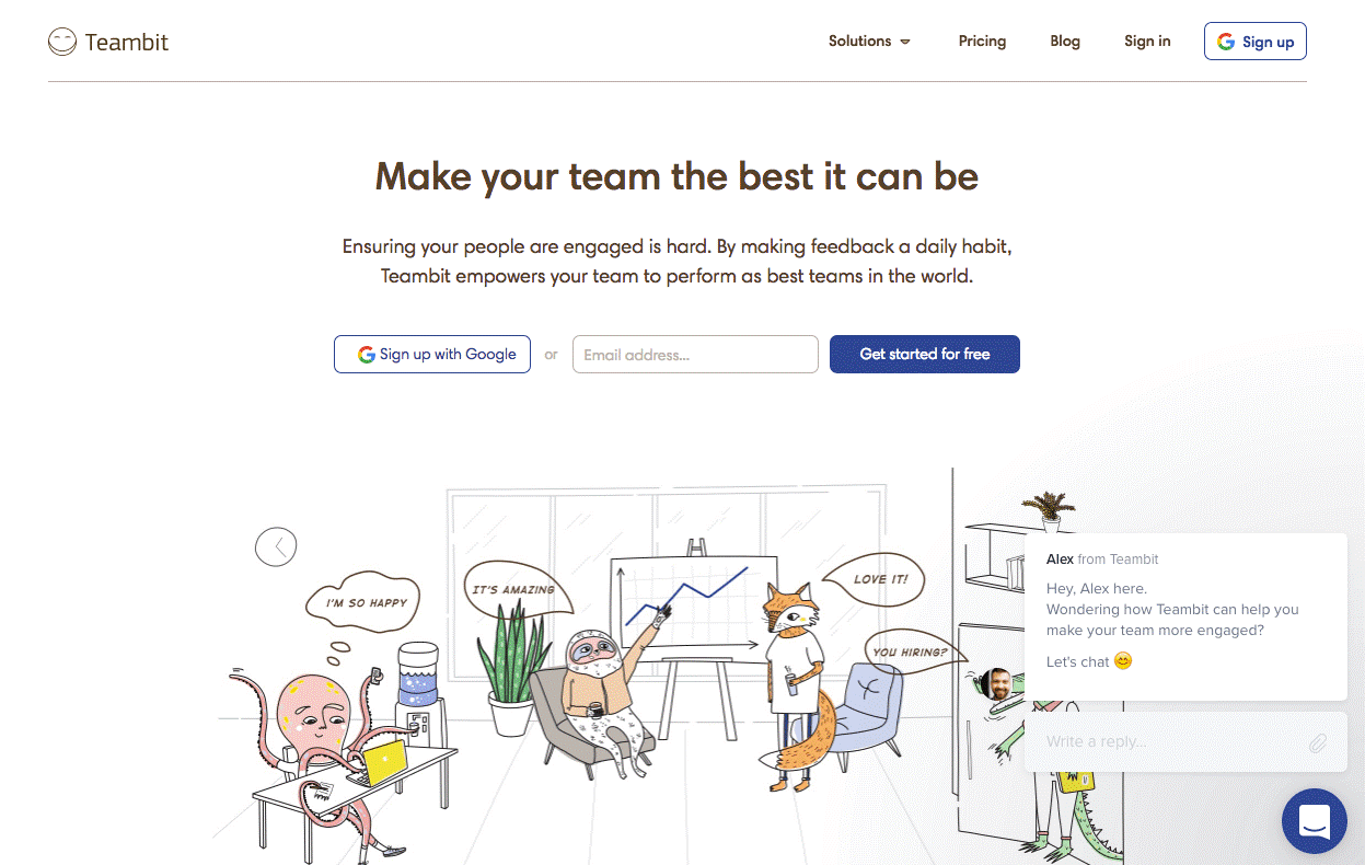 L’outil de gestion de feedback interne Teambit est un bel exemple d’intégration de touche d’humour réussie. Le site a fait le pari d’insérer une multitude de dessins sur sa Home Page. Avec eux, la plateforme parvient à donner vie au besoin auquel elle s’attaque et les bénéfices qu’elle contribue à fournir.