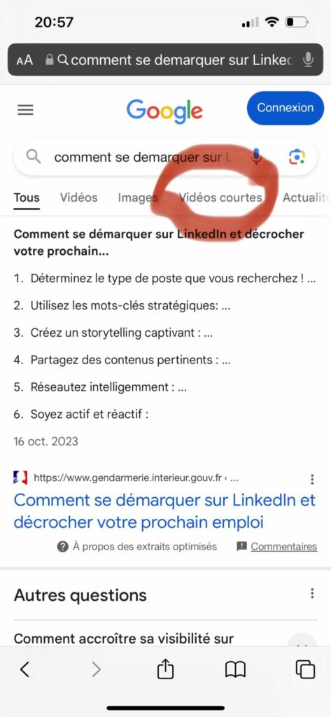 Mais quelle est la différence entre « Vidéos » et « Vidéos courtes » dans Google Chrome ? À première vue, la présentation des résultats de recherche dans ces deux onglets est bien différente. Dans « Vidéos », les contenus apparaissent avec un format classique en 16:9 (horizontal). En revanche, dans « Vidéos courtes », les résultats s’affichent dans un format portrait.
