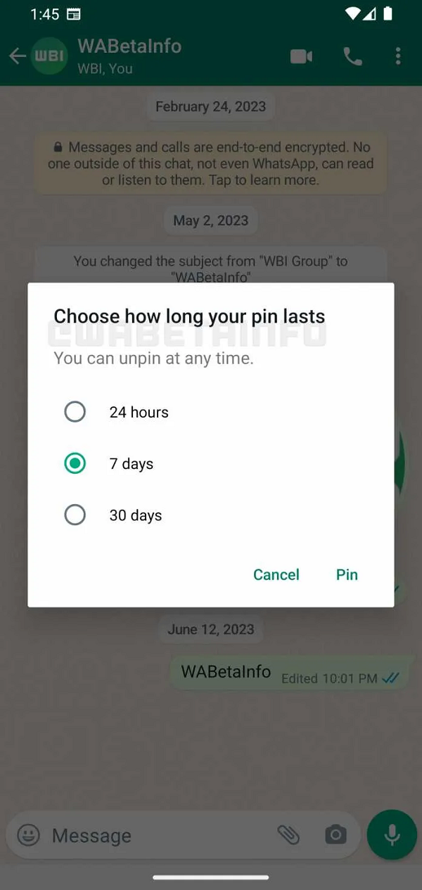 24 heures, 7 jours et 30 jours. WhatsApp souhaite effectivement vous proposer ces 3 durées différentes grâce à la mise à jour bêta de WhatsApp pour Android 2.23.13.11. Il sera ainsi bientôt possible de sélectionner une durée spécifique après laquelle le message épinglé est automatiquement retiré.